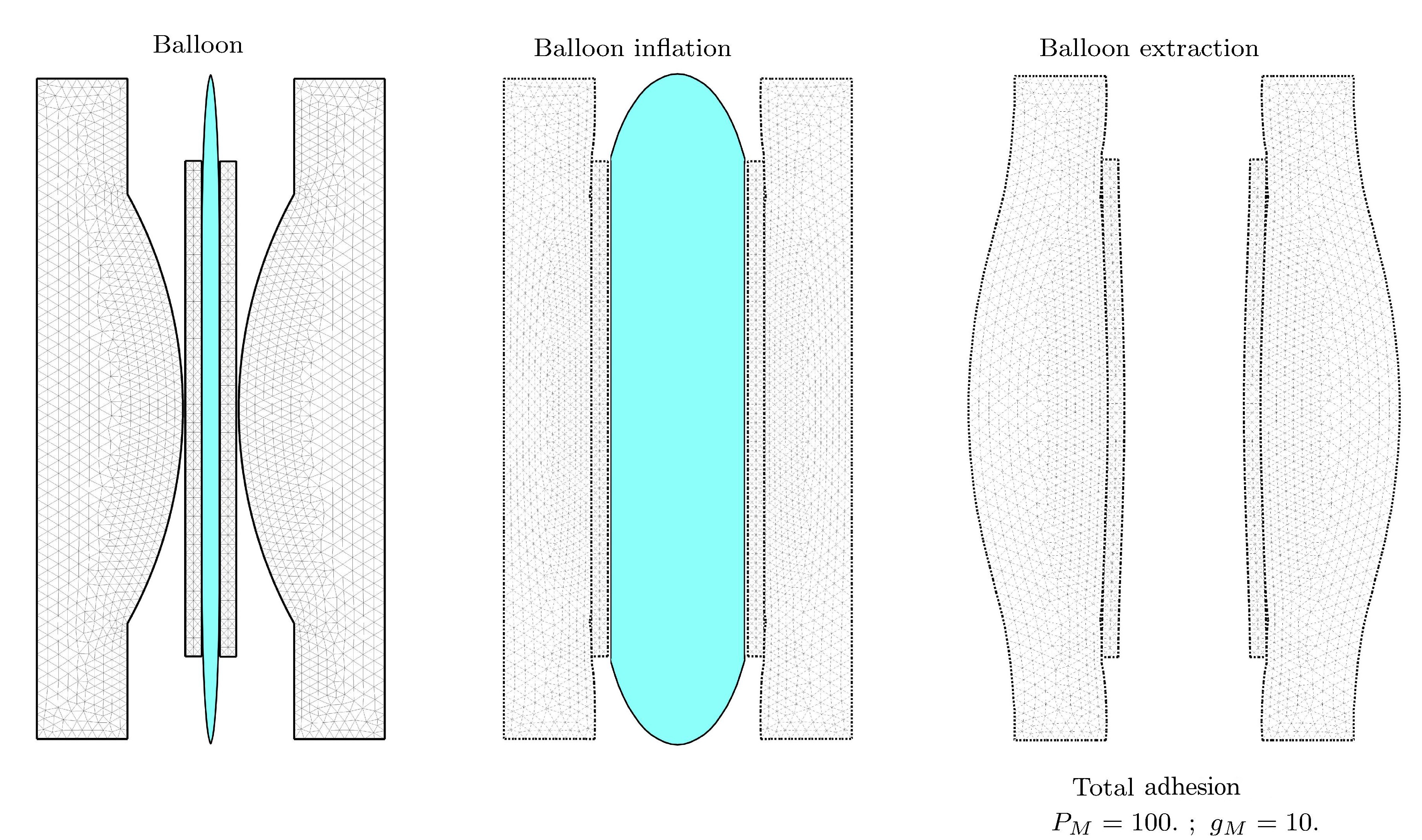 Ce séminaire présente un modèle énergétique cohérent de contact adhésif persistant pour des matériaux hyperélastiques soumis à de grandes déformations. Le modèle généralise la condition classique de contact persistant au cas adhésif, en garantissant la cohérence énergétique aussi bien au niveau continu qu’après discrétisation en temps. La formulation permet un traitement unifié des différents régimes de contact — adhérence, décohésion et glissement — tout en assurant la stabilité physique et numérique. Le cadre théorique repose sur une approche variationnelle adaptée aux comportements non linéaires. Une stratégie numérique combinant éléments finis non linéaires, intégration implicite en temps et algorithme de type Primal–Dual Active Set est proposée. Des simulations illustrent la robustesse du modèle et mettent en évidence l’influence de l’adhésion et des effets visqueux, notamment dans des applications biomécaniques.Mots clés : Contact adhésif ; Cohérence énergétique ; Hyperélasticité ; Grandes déformations ; Méthodes variationnelles.